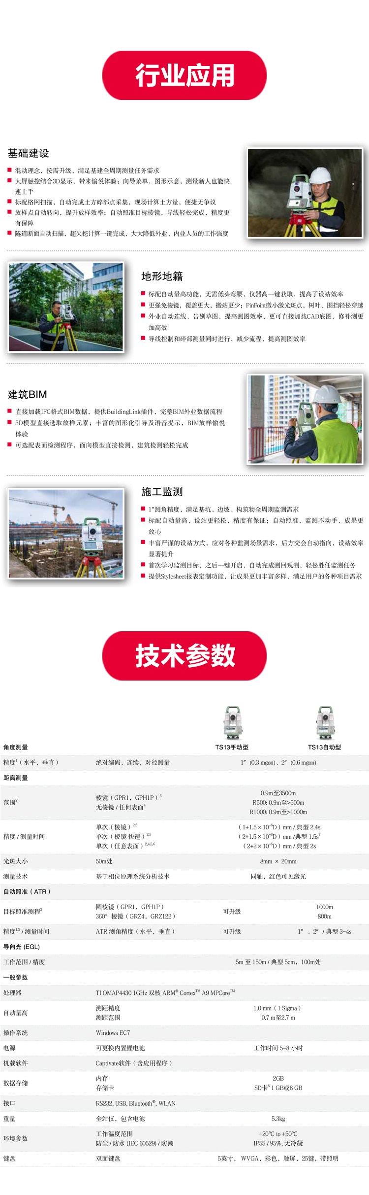 徠卡TS13自動(dòng)型全站儀使用了成熟的Captivate機(jī)載系統(tǒng),搭配5英寸彩色觸屏,不僅擁有流暢的3D界面設(shè)計(jì),提供豐富的圖形化引導(dǎo)和流程化的菜單設(shè)計(jì),還擁有長(zhǎng)期以來(lái)研發(fā)的多種本地化程序,貼合國(guó)內(nèi)測(cè)量規(guī)范和用戶需求。