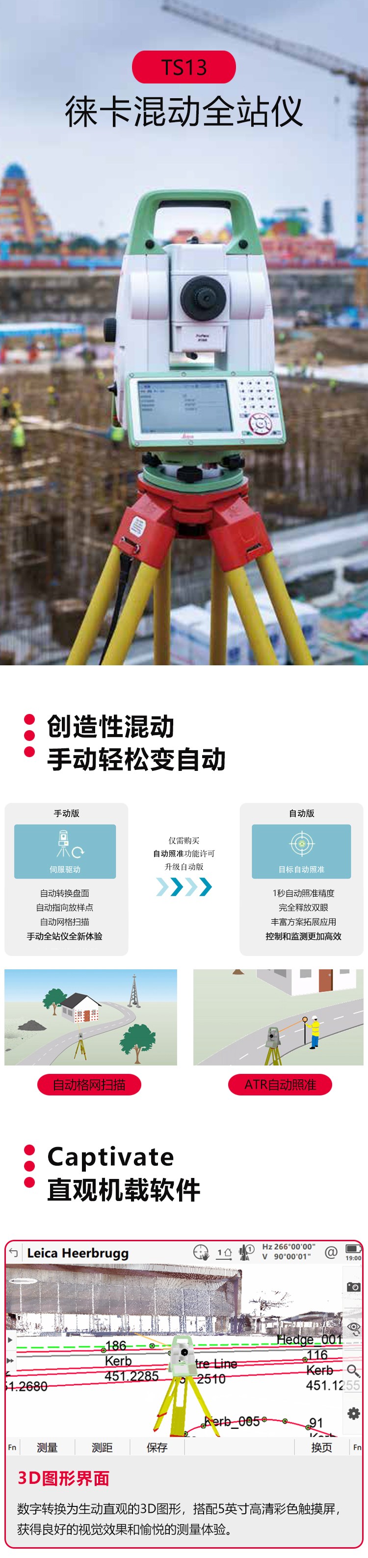 徠卡TS13自動(dòng)型全站儀是徠卡測(cè)量為響應(yīng)用戶多樣化的自動(dòng)化需求而推出,在保持一貫的高品質(zhì)基礎(chǔ)上,標(biāo)配ATR自動(dòng)照準(zhǔn)和自動(dòng)量高功能,按需靈活選配自動(dòng)搜索和棱鏡鎖定功能。搭載Captivate機(jī)載系統(tǒng),暢享豐富本地化應(yīng)用。真正做到“把錢花在刀刃上”。